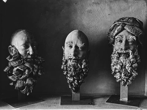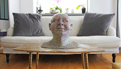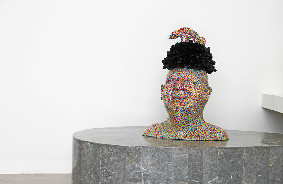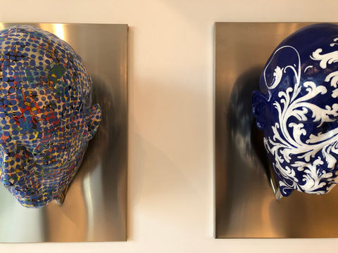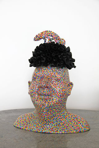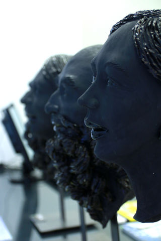 Da questa esperienza nascono alcune sculture in resina che riprendono l’idea del ritratto seriale; collocate su una lastra di acciaio, attaccate al muro, come trofei di caccia, non mostrano segni somatici riconoscibili, ma diventano supporto e pretesto per una texture esuberante, che prende il sopravvento sulla struttura somatica dei volti e li rende anonimi supporti. Ovvero, con la stessa logica del trofeo, volti paffuti di adolescenti, tutt’altro che umani, sorridono dal muro, con colorazioni forti e prepotenti: il verde, il rosso, l’azzurro su questi grossi volti di resina diventano materici e concreti, lucidi fino a brillare.
