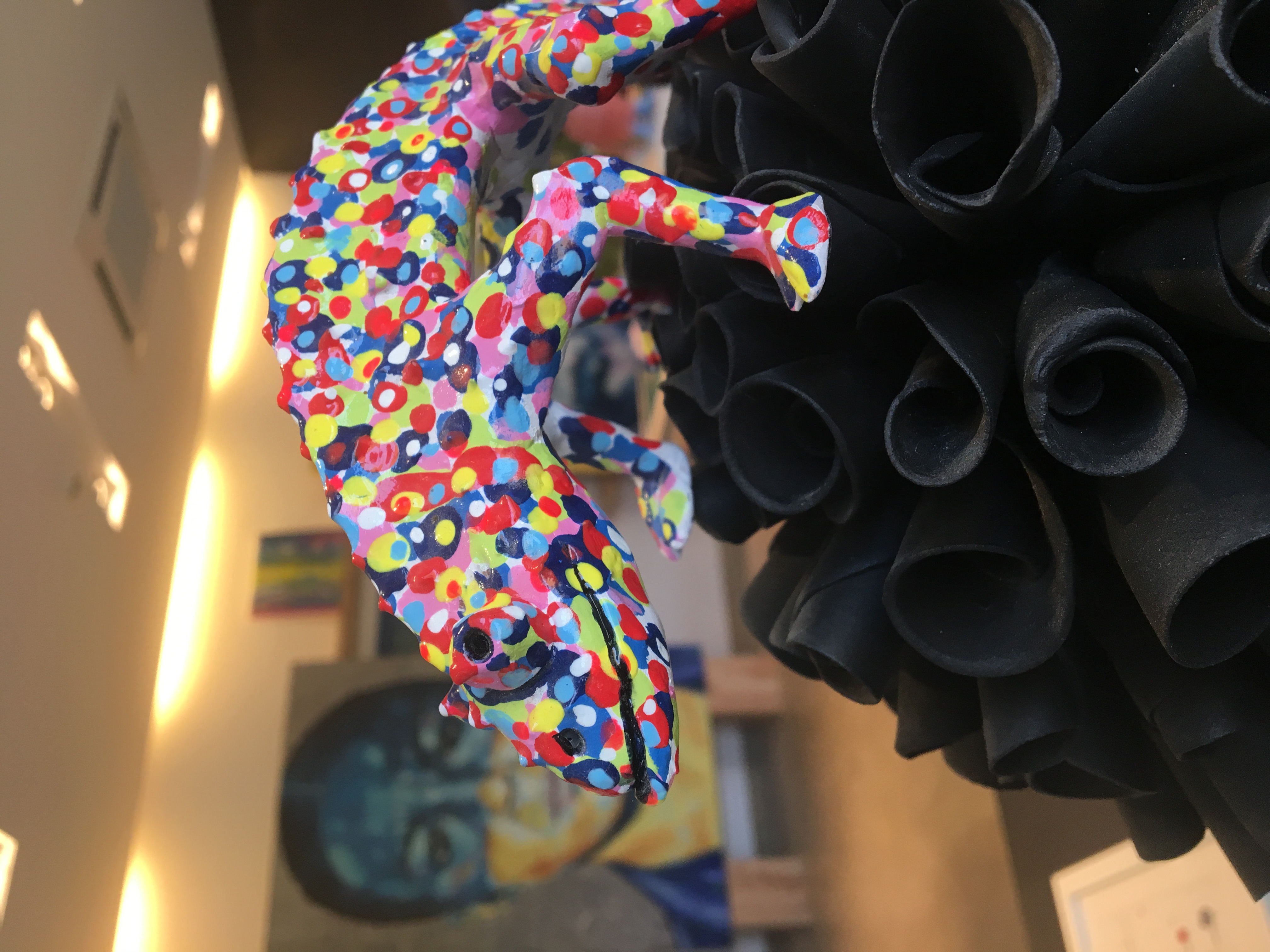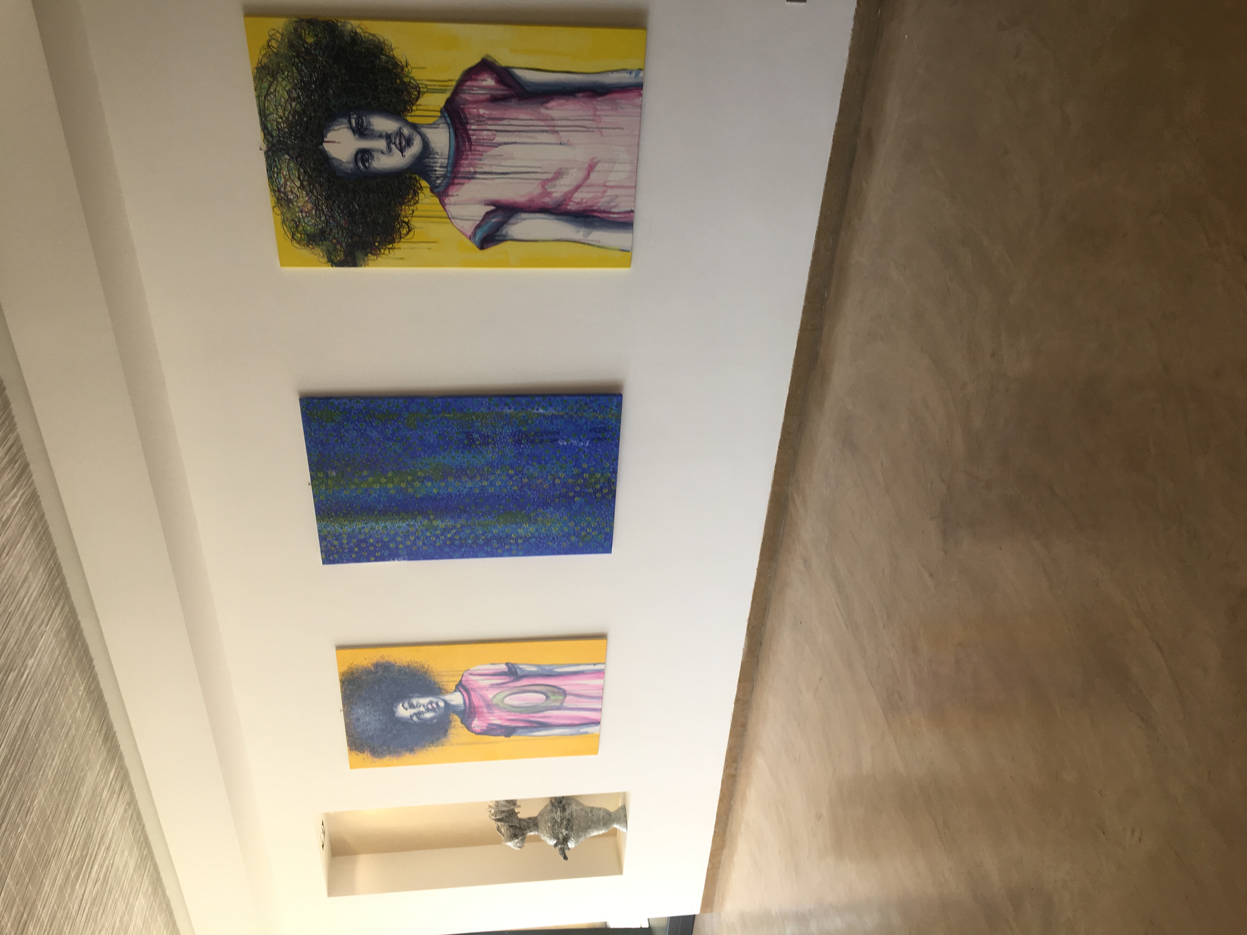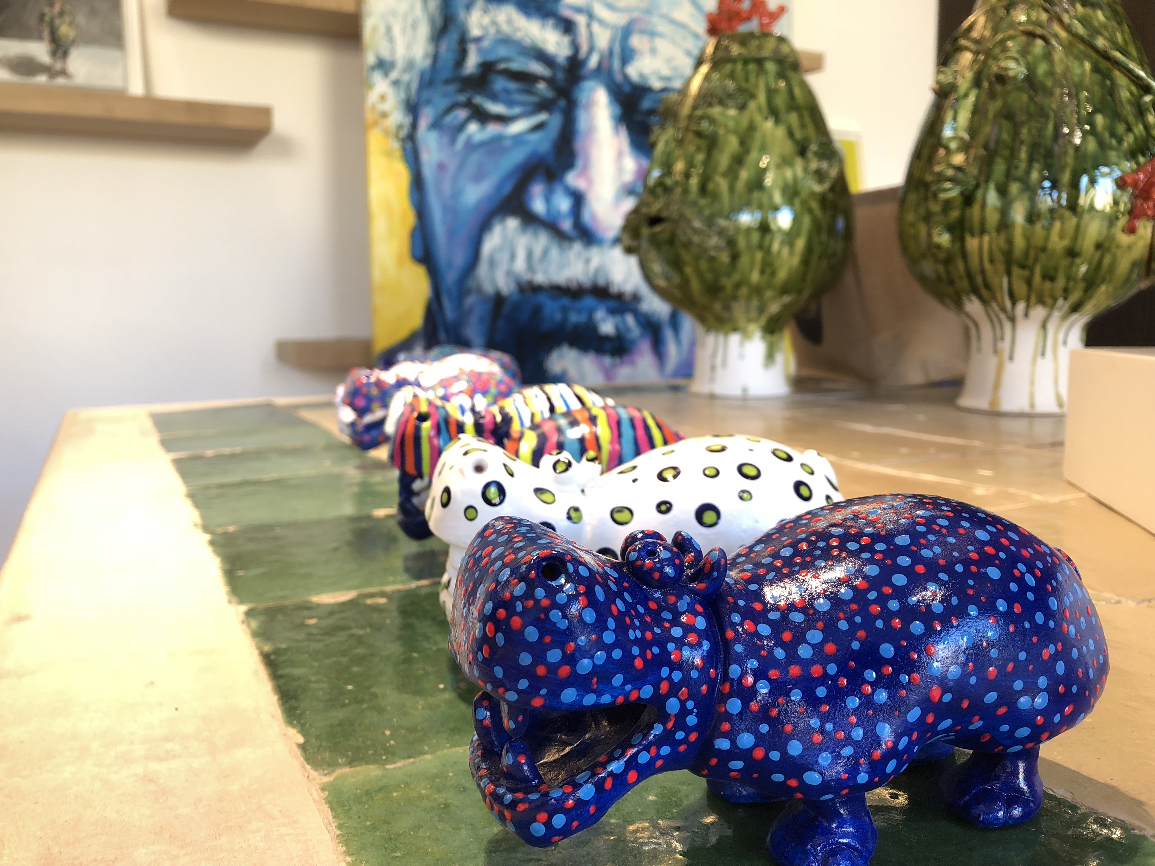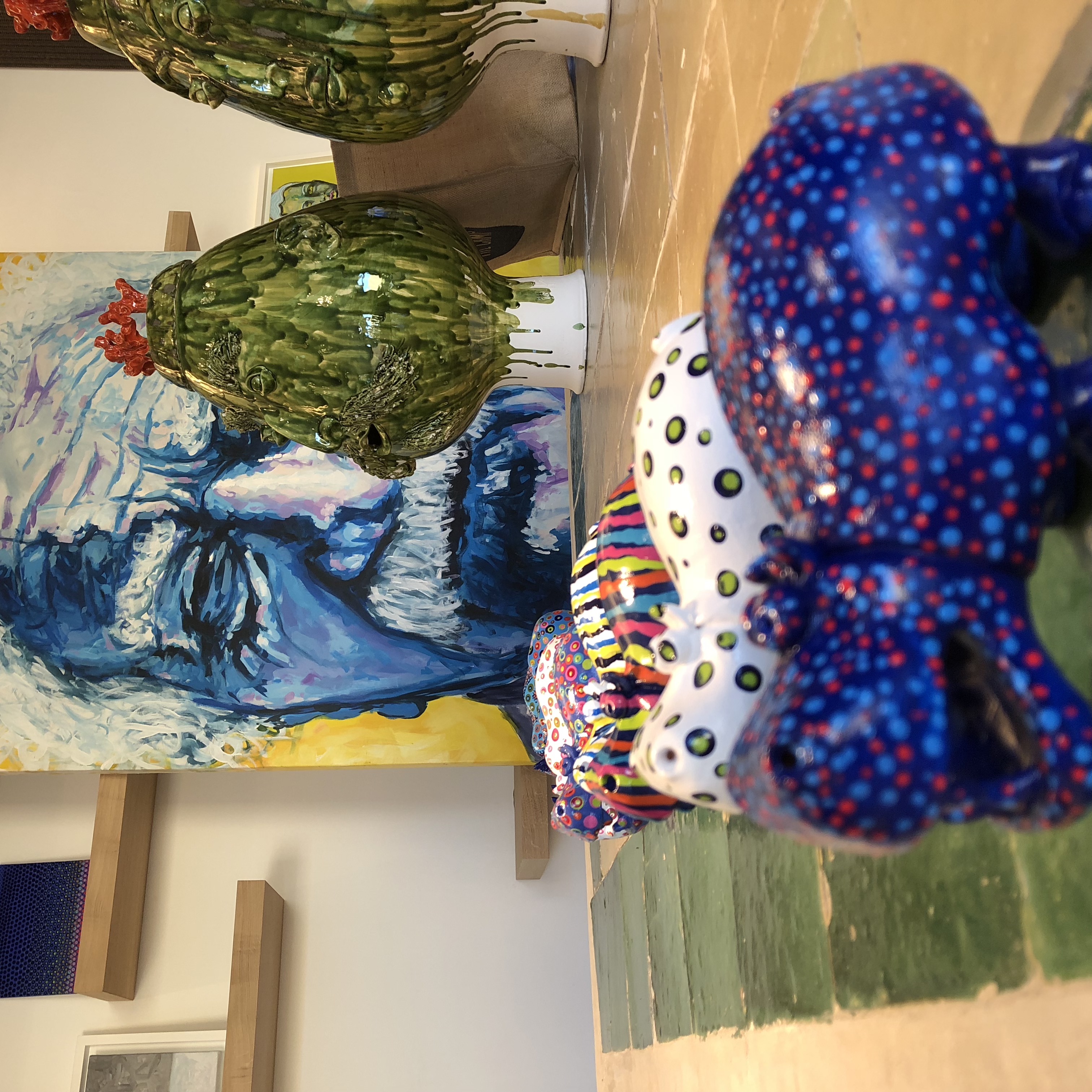 Spesso il colore diventa ricerca di volumi e si amplia la mia sperimentazione: la mano si orienta a cercare ciò che nella mia immaginazione già esiste, si materializza e si traduce nel gioco di macchie, punti, texture che prendono corpo, si aggregano, si allontanano, si fondono e nascono promontori, paesaggi, palme, oggetti, animali fantasiosi e reali che diventano protagonisti del mio racconto grafico.
