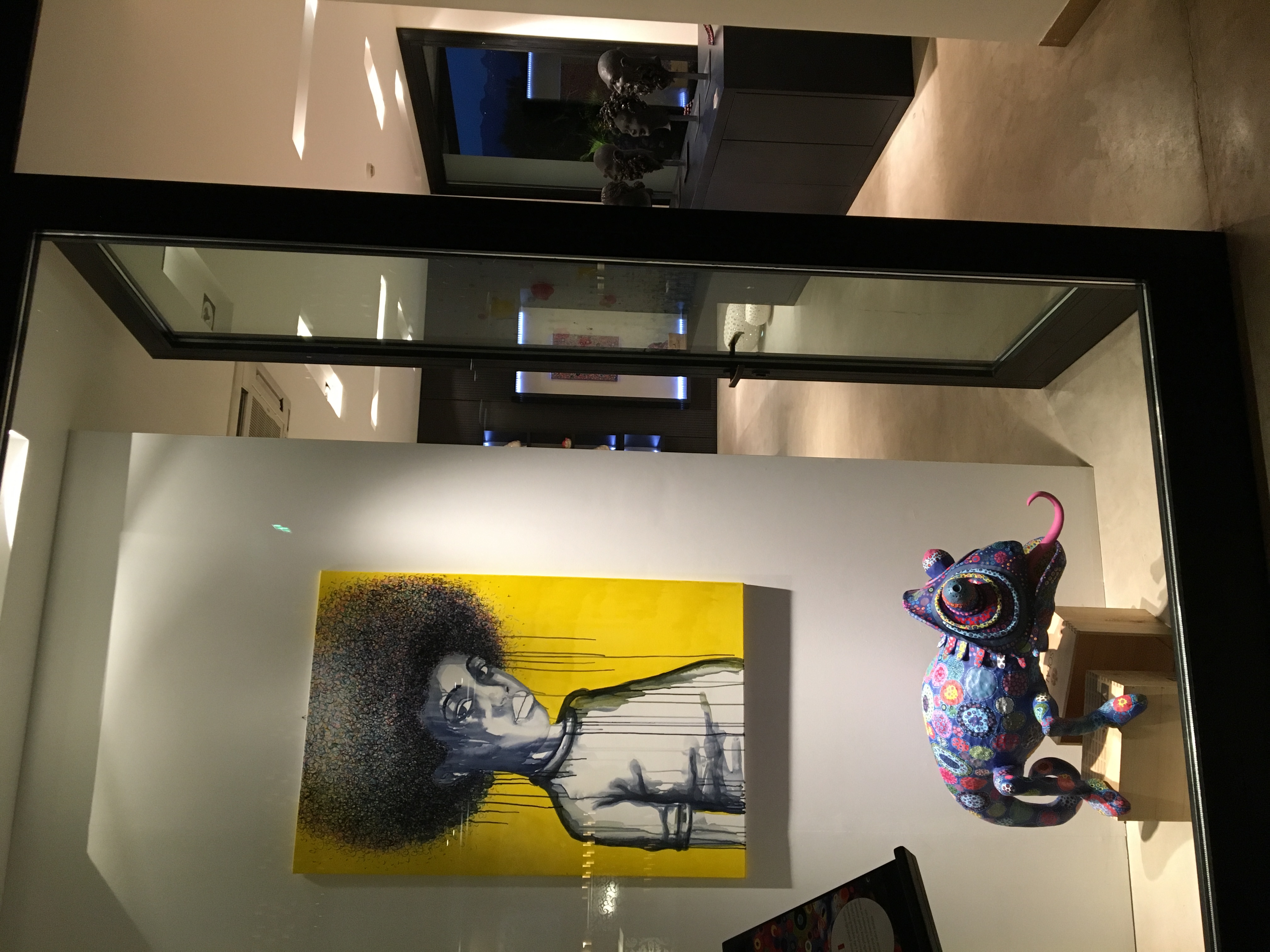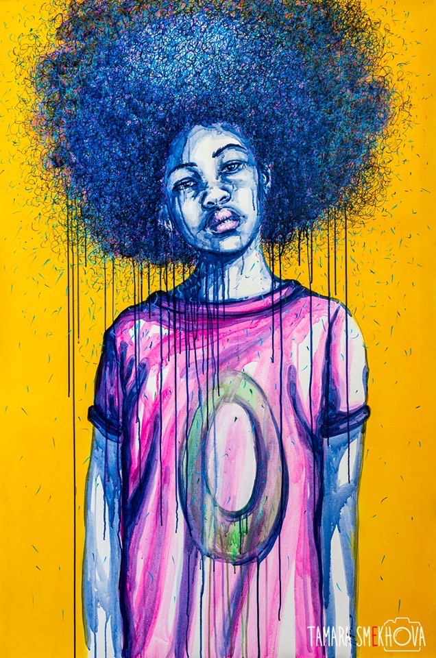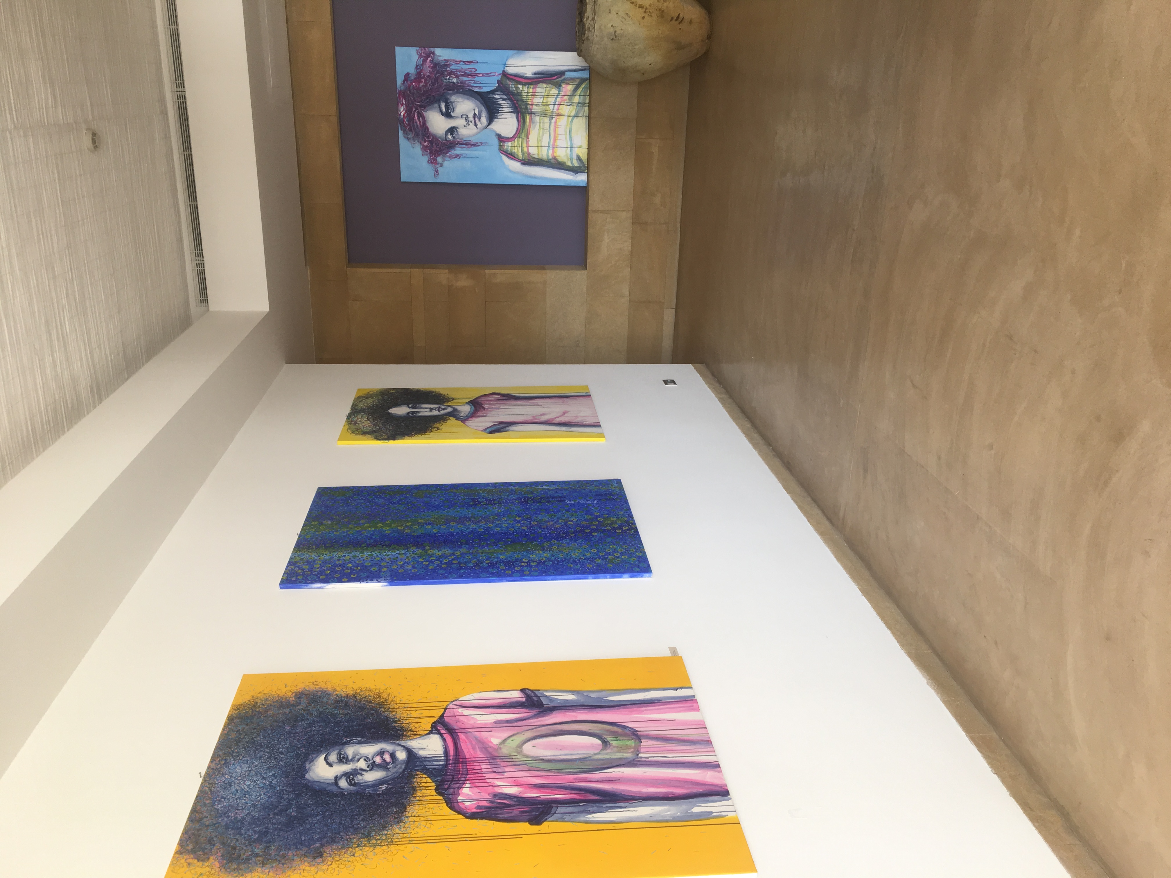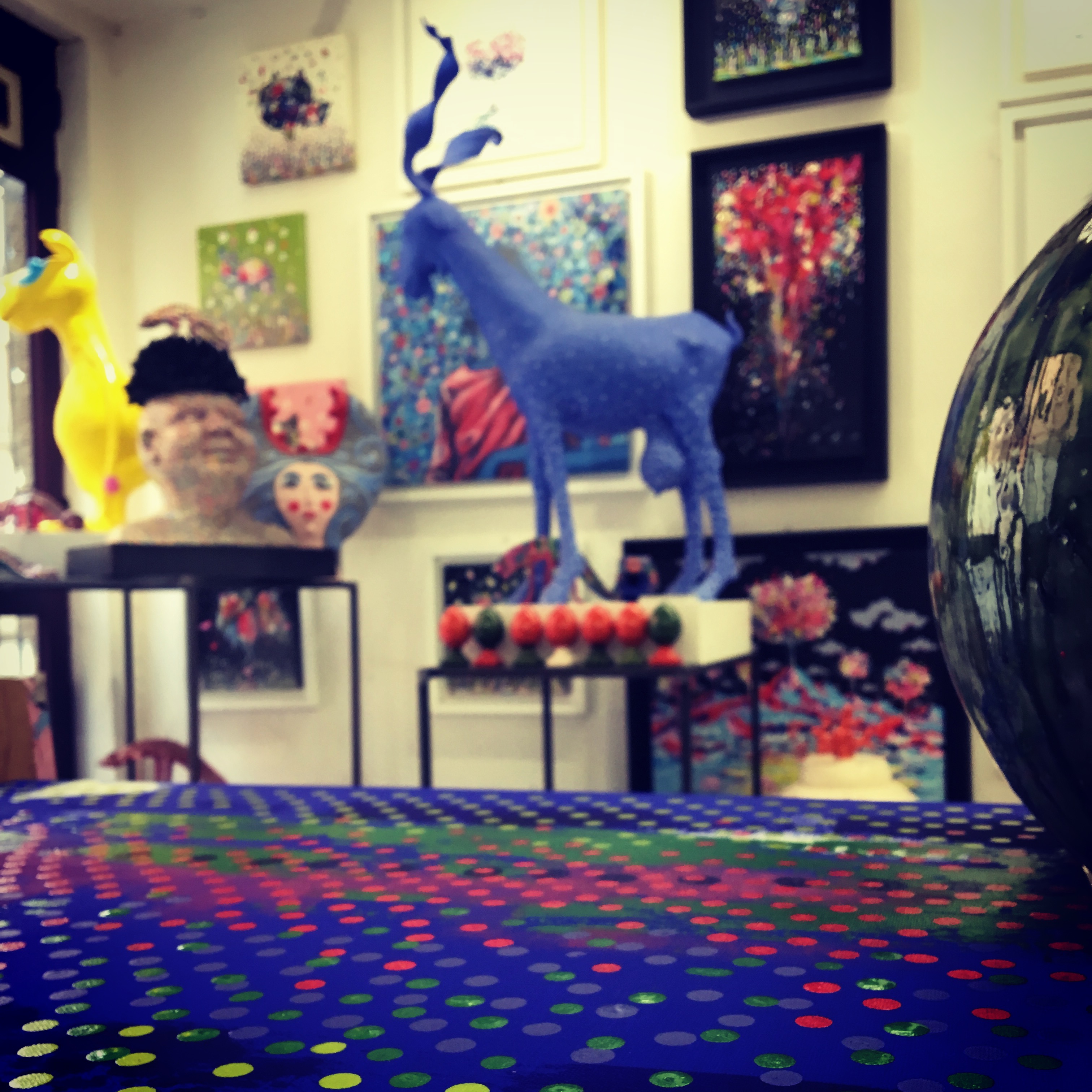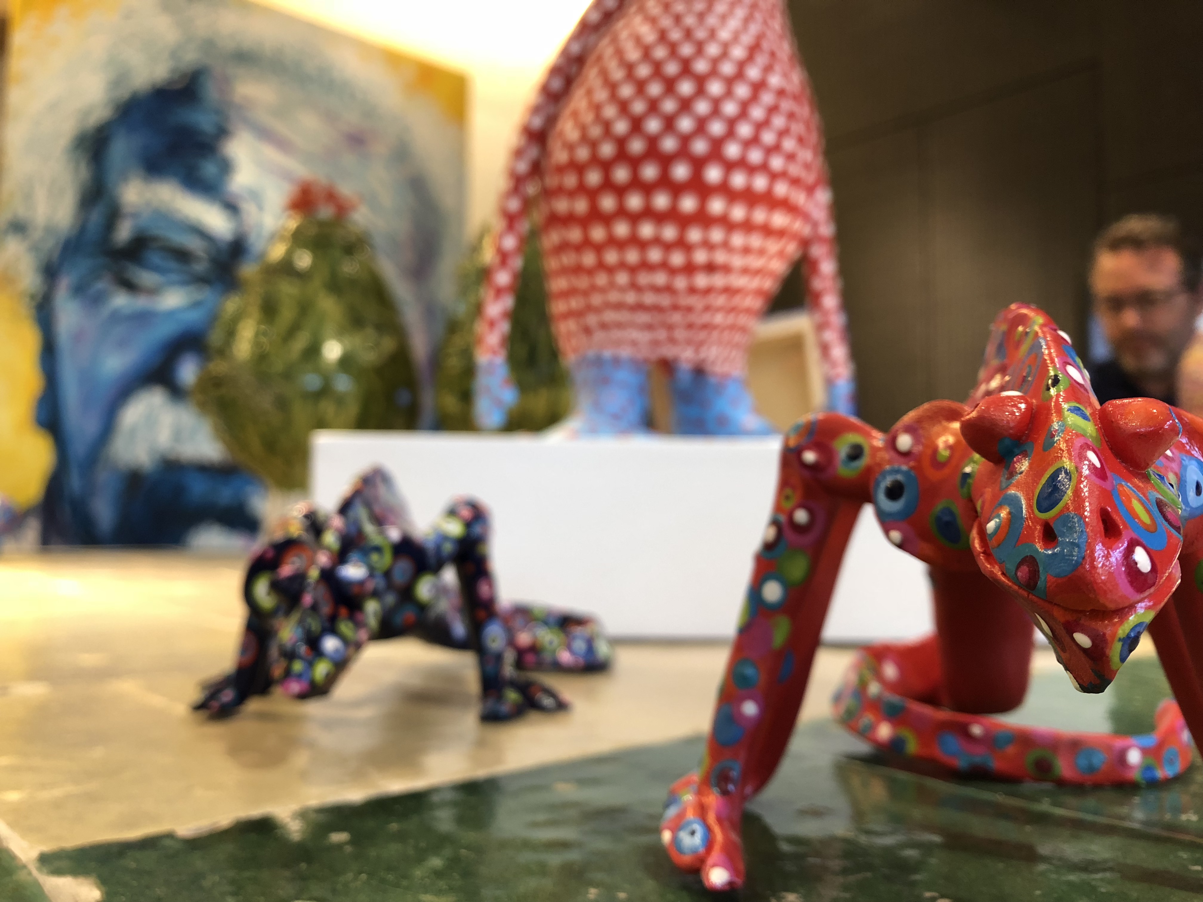 Spesso il colore diventa ricerca di volumi e si amplia la mia sperimentazione: la mano si orienta a cercare ciò che nella mia immaginazione già esiste, si materializza e si traduce nel gioco di macchie, punti, texture che prendono corpo, si aggregano, si allontanano, si fondono e nascono promontori, paesaggi, palme, oggetti, animali fantasiosi e reali che diventano protagonisti del mio racconto grafico.